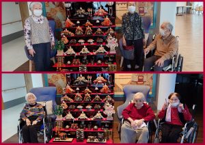 エントランス前に飾ったひな人形の前で記念の写真を撮りました。